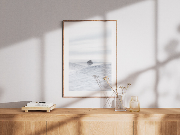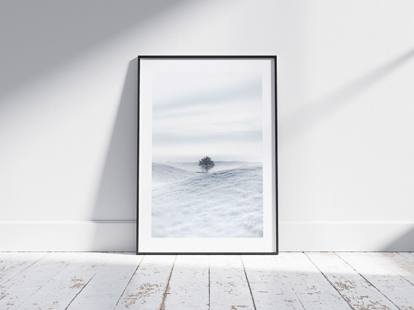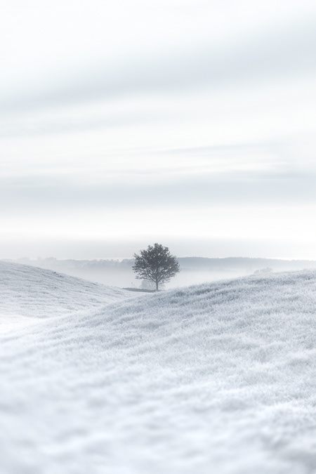 En tilstand af indre ro. Det enkelte træ står alene i landskabet, omgivet af bløde former og dæmpet lys. En følelse af stilhed og balance, hvor verden er skrællet ned til det nødvendige, og hvor det at være alene opleves som et roligt nærvær snarere end fravær.