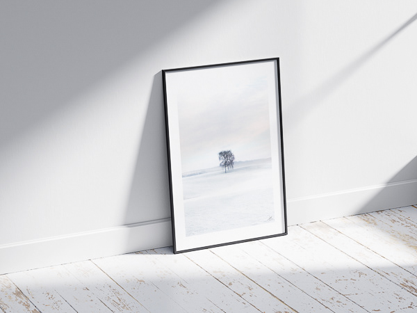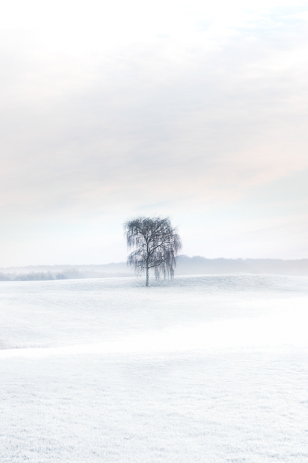 Stille isolation. Træet står alene i et åbent, næsten opløst landskab, omgivet af lys og luft. En følelse af skrøbelig balance opstår, som et mentalt rum, hvor alt er dæmpet, og hvor stilheden bliver bærende frem for tom.