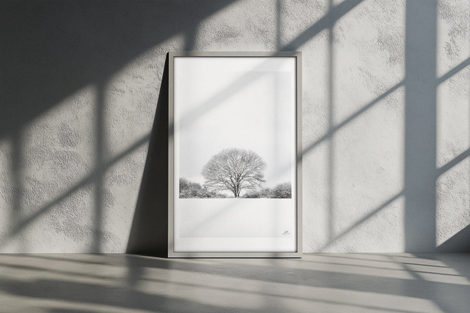 Repræsentation af en tilstand af indre orden og afklarethed. Træet står centreret og balanceret, som et fast punkt i et ellers opløst rum. En følelse af ro og stabilitet opstår — et mentalt øjeblik, hvor alt falder på plads.