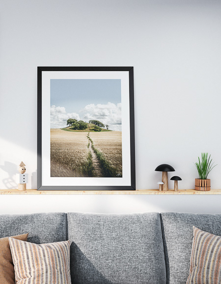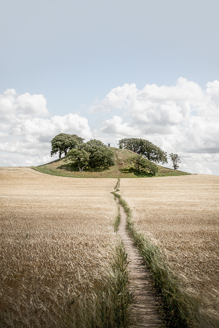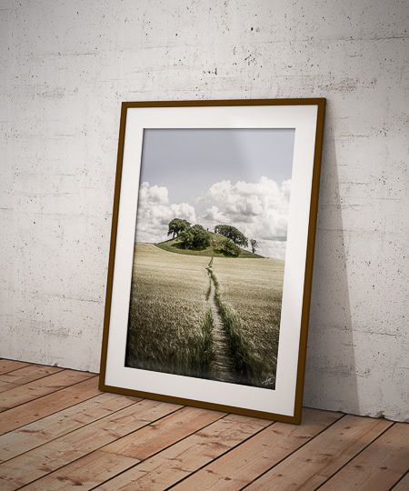 Kompositionen er organiseret omkring en central akse, hvor stien fungerer som både retning og forankring. De åbne flader på hver side skaber balance, mens højen samler billedets vægt. Et kontrolleret rum, hvor bevægelse og stabilitet eksisterer samtidig.